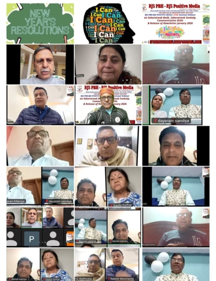 नई दिल्ली – प्राचीन विरासत और आधुनिक आकांक्षाओं के बीच एक मजबूत सेतु बनाते हुए, राम जानकी संस्थान (आरजेएस) पॉजिटिव ब्रॉडकास्टिंग हाउस (पीबीएच) ने अपने 519वें राष्ट्रीय वेबिनार में भारत की स्वतंत्रता के शताब्दी वर्ष 2047 तक एक ‘सकारात्मक भारत’ के निर्माण का मार्ग प्रशस्त किया। “अमृत काल का सकारात्मक भारत उदय” विषय पर संचार कौशल आधारित इस वैश्विक वेबिनार में , सकारात्मक बोध व संकल्प और संचार कौशल के वैज्ञानिक विरासत को स्थापित करने के उद्देश्य से 17-सूत्रीय एजेंडा लॉन्च किया गया। गुरु रविदास जयंती 1 फरवरी 2026 के उपलक्ष्य में 31 जनवरी को आयोजित संगोष्ठी में फरवरी माह के लिए सकारात्मक आयोजन में दयाराम सारोलिया, राजेन्द्र सिंह कुशवाहा, दयाराम मालवीय और कमल मालवीय अग्रणी भूमिका निभाने का संकल्प लिए. बाकी लोगों ने कार्यक्रमों में केवल जुड़ने का संकल्प दुहराया।
