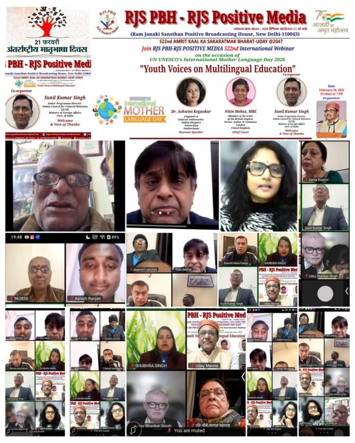 नई दिल्ली — राम जानकी संस्थान पॉजिटिव ब्रॉडकास्टिंग हाउस (आरजेएस पीबीएच) और आरजेएस पाॅजिटिव मीडिया के संयुक्त तत्वावधान में अंतरराष्ट्रीय मातृभाषा दिवस की पूर्व संध्या पर आयोजित 522वें वेबिनार में विशेषज्ञों ने यह महत्वपूर्ण निष्कर्ष निकाला। यूनाइटेड किंगडम, नीदरलैंड और भारत के विभिन्न हिस्सों के प्रतिनिधियों की भागीदारी वाले इस मैराथन सत्र में यह तर्क दिया गया कि मातृभाषा न केवल संज्ञानात्मक विकास का प्राथमिक इंजन है, बल्कि वैश्विक स्तर पर ‘सॉफ्ट पावर’ का एक रणनीतिक साधन भी है। कार्यक्रम में टीफा26 के राजेश परमार साहेबजी,उदय शंकर सिंह कुशवाहा, आकांक्षा, मयंक राज,सपरिवार दयाराम सारोलिया, सरिता कपूर, रति चौबे, रिन्ने मीराजा, शुभ्रा सिंह, राकेश मनचंदा,आशीष रंजन ,सोनू कुमार,अमित मानव आदि जुड़े।