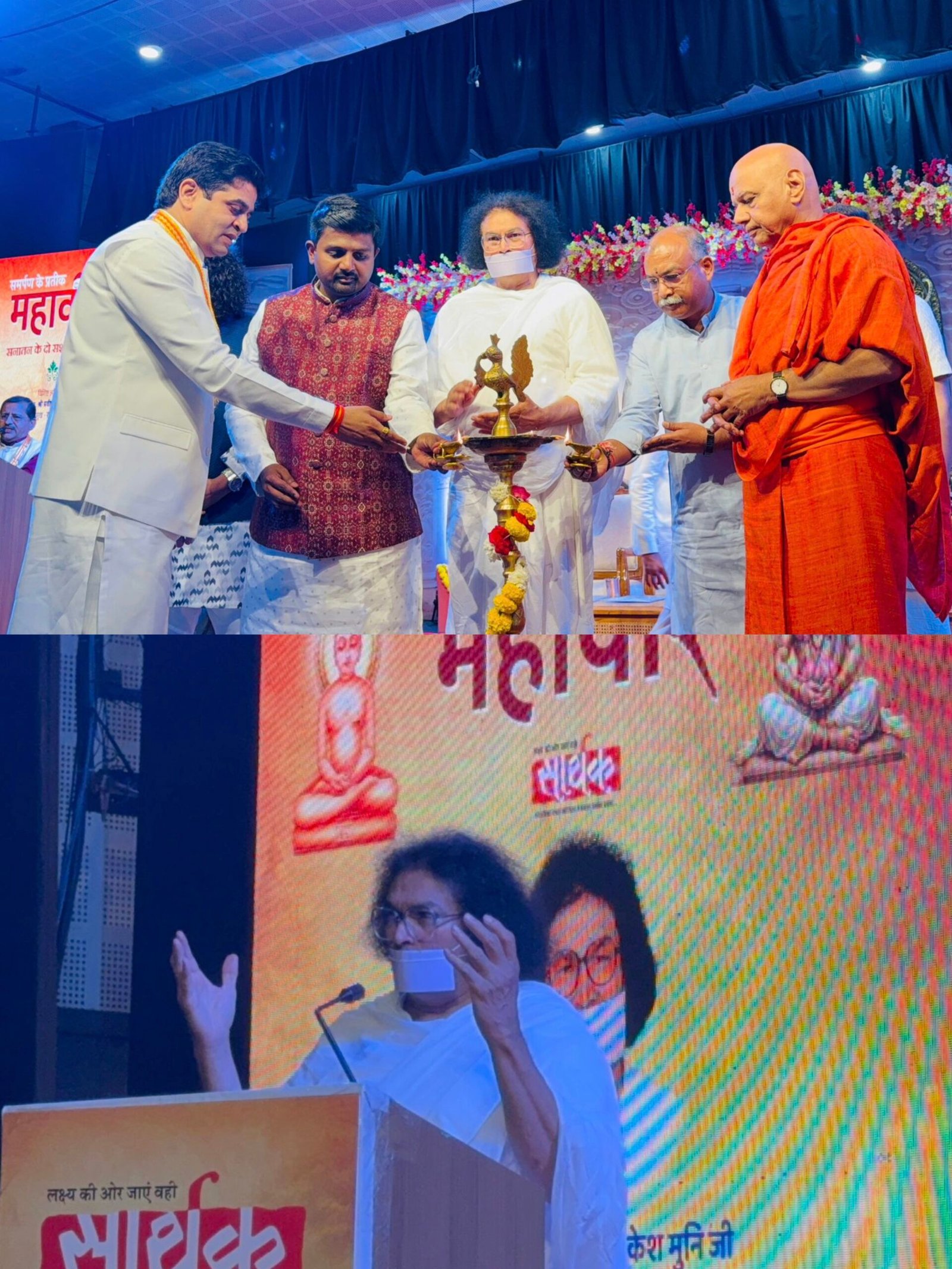 अहिंसा विश्व भारती एवं विश्व शांति केंद्र के संस्थापक जैन आचार्य लोकेश जी, श्रीराम जन्मभूमि तीर्थ क्षेत्र ट्रस्ट के कोषाध्यक्ष स्वामी गोविंद देव गिरी जी महाराज, राष्ट्रीय स्वयं सेवक संघ के क्षेत्र संपर्क प्रमुख श्री प्रवीण जी गुप्त, ने भगवान महावीर एवं बजरंगबली हनुमान जी के जन्मोत्सव के अवसर पर इंदौर मे आयोजित ‘समर्पण के प्रतीक महावीर’ सम्मेलन में आध्यात्मिक उद्बोधन दिया |