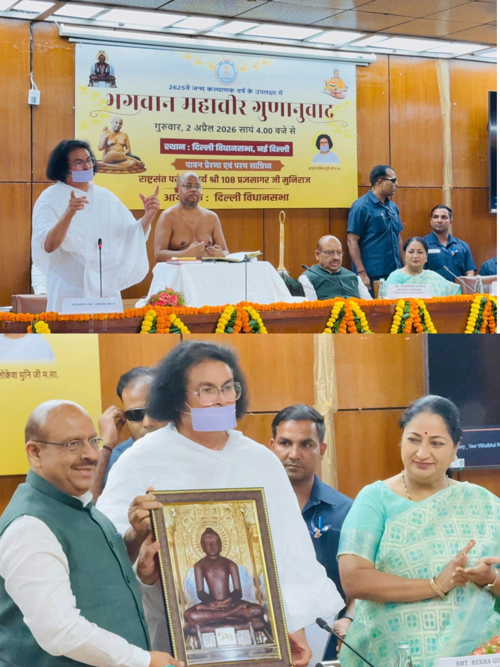 नई दिल्ली | भगवान महावीर के 2625 जन्म जयंती के उपलक्ष में दिल्ली विधानसभा में आयोजित समारोह को विधानसभा अध्यक्ष श्री विजेंद्र गुप्ता, दिल्ली की मुख्यमंत्री श्रीमती रेखा गुप्ता विश्व विख्यात जैन आचार्य लोकेशजी, परंपराचार्य श्री प्रज्ञसागरजी मुनिराज ने संबोधित किया |